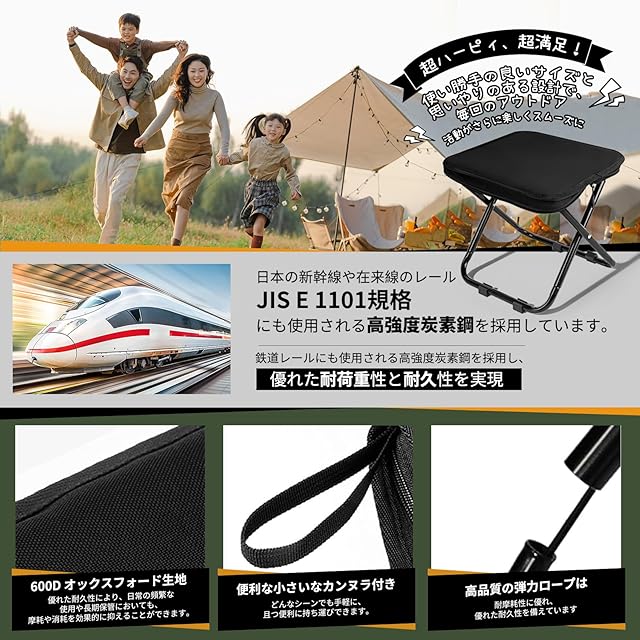 【高耐荷重で安定感抜群600Dオックスフォード布】日本の新幹線や在来線のレール(JIS E 1101規格)にも使われる高強度炭素鋼フレームを採用。優れた硬さと剛性を備え、耐荷重110kgはもちろん、アウトドアでも安心してご使用いただけます。座面には厚手の600Dオックスフォード布を使用し、しっかりとした張りと安定した座り心地を実現。耐久性に優れるだけでなく、通気性にも配慮されているため、長時間でも快適にお過ごしいただけます。