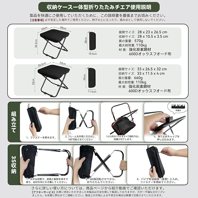 【折りたたみ椅子仕様】展開サイズ:約28×23×26.5cm、約33x26.5x32cm。折りたたみ時はわずか28×10.5×3.5cmで、折りたたみ傘のようにスリムに収納可能。バックパックや車の収納スペースにもすっきり収まり、持ち運びがとても簡単です。ご使用の際は一気に勢いよく腰掛けず、ゆっくりと安定して着座・立ち上がりをお願いいたします。瞬間的に大きな荷重がかかると、本来の体重以上の力が加わり、製品に負担がかかる場合がございます。