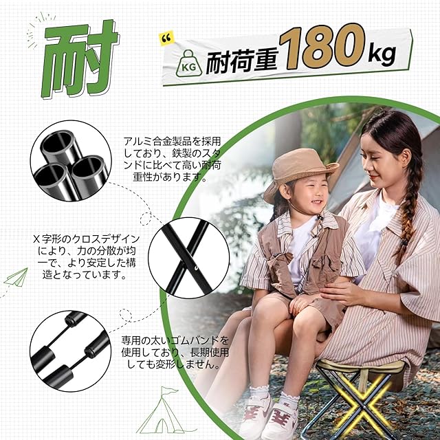 【最大耐荷重180kg】アルミ合金、広い開閉範囲のX型デザインを採用することで、折りたたみ椅子の積載量が大幅に向上しております。180kgの重量でもらくらく支えきります。また、より優れた素材は、折りたたみ椅子により長い耐用年数をくれます。長時間座っても快適で、膝を深く曲げずに座れる設計が特徴です。また、座面裏にはクロスで補強が施され、座った際に沈み込みにくく、安定した座り心地を提供します。