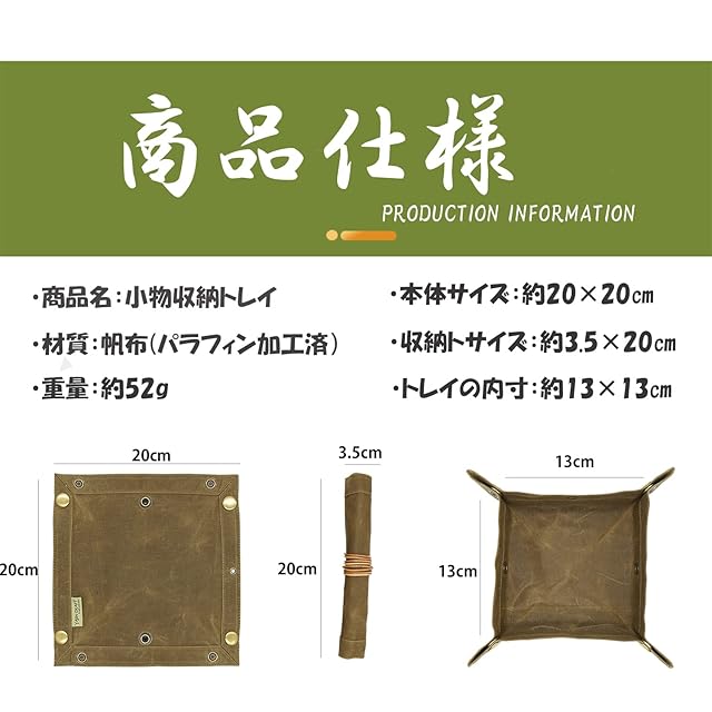 YAJIN CRAFT マルチシート 小物収納トレイ 物置きマット 20cm×20cm グランドシート 多機能 防水 パラフィン加工 綿帆布 アウトドア キャンプ