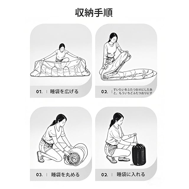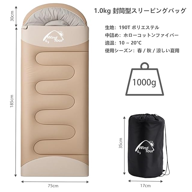 使用サイズ:寝袋サイズは(185+30)*75 cmで、大人一人には十分です。収納サイズ:約35×17cm。