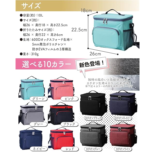 ✅【商品規格】 容量(約):10L サイズ(約):幅26 × 奥行18 × 高さ22.5cm 折りたたみサイズ(約):幅26 × 奥行22 × 高さ6cm 生地:600Dオックスフォード生地×5mm発泡ポリエチレン×防水EVAフィルムの3層構造 重さ:310g