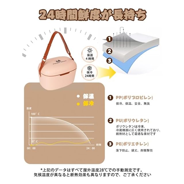 【保冷・保温・長時間の鮮度キープ|アウトドアに最適な保温ボックス】このおしゃれでコンパクトな保温ボックスは、日帰りのお出かけやピクニック、アウトドア活動にとても適しています。本体には高品質なPUポリウレタンフォームを断熱材として採用していて、優れた保冷・保温効果を実現しています。冷蔵・鮮度保持は12〜24時間、保温は約4時間持続し、飲み物やフルーツの新鮮さをしっかり保ちます。