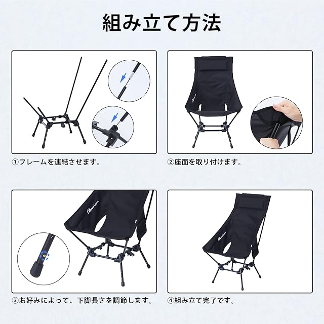 【4段階高さ調整&3パターン角度調節】あぐらタイプから、ハイタイプまで対応できる4段階高さ調整のキャンプチェアです。また、前後脚の高さ調節を通じて、通常の「ゆったりタイプ」から、後ろ脚を伸ばした「まじめにすわるタイプ」、前の脚を伸ばした「よぞら見あげタイプ」が可能です。