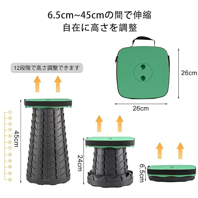 【利便性】 折りたたみチェア正規品、たった1秒で開閉可能です。6.5cmから45cmまで、12段階で高さ調整できます。設置する場 所を問わず、最適な高さで使えます。たたむと高さ6.5cm、直径26cmの角型状になるので、収納も楽々!