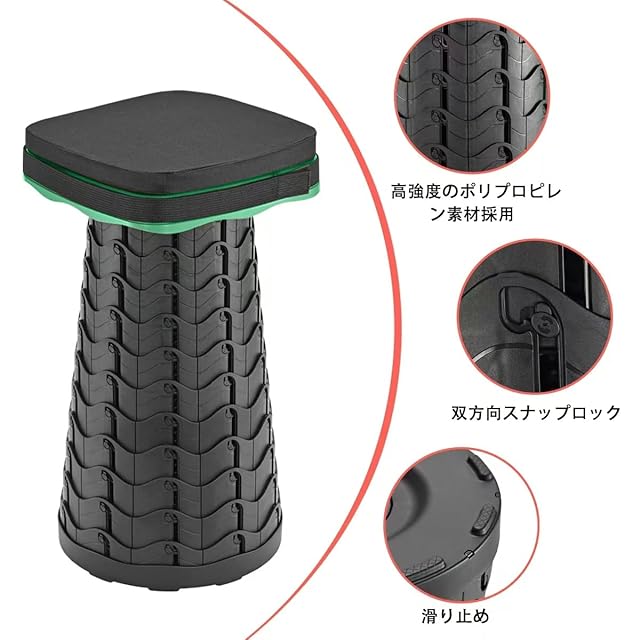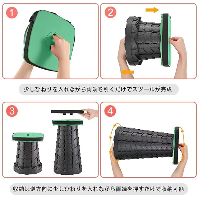 【使い方簡単、持ち運び便利】使い方簡単:少しひねりを入れながら両端を引くだけでスツールが完成。収納は逆方向に少しひねり を入れながら両端を押すだけで収納可能。また、ストラップ付きで、手に持ってでも、肩に掛けても、便利です。
