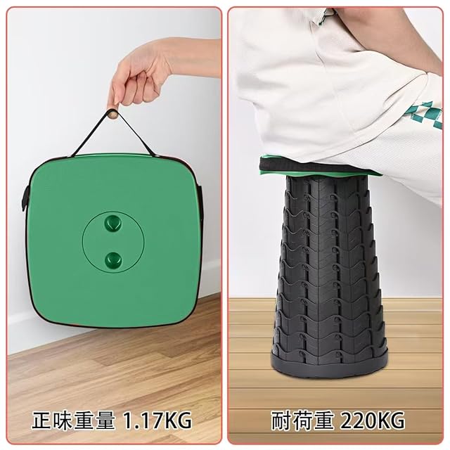 折りたたみ椅子 キャンプ椅子 伸縮式 折り畳み式アウトドアチェア 軽量 コンパクト 持ち運び便利 耐荷重220KG 一秒開閉でき 高さ 調整可能 6.5-45CM 【意匠登録】 釣り 旅行 バーベキュー 行列待ち アウトドアスポーツ 収納バッグ付き (グリーン+角型 + シー トクッション)