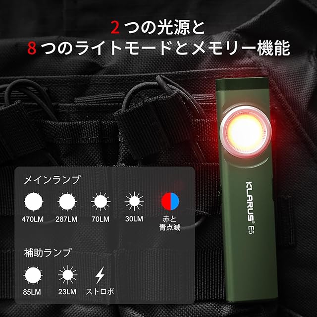 【デュアル光源】フロントライトとトップライトの両方を搭載。最大出力470ルーメン。メインライト5モード+トップライト3モードで、様々な明るさのニーズに対応。メモリー機能により、懐中電灯が最後に消灯したモードと明るさに入ることができます(STROBとTURBOはメモリーされません)。