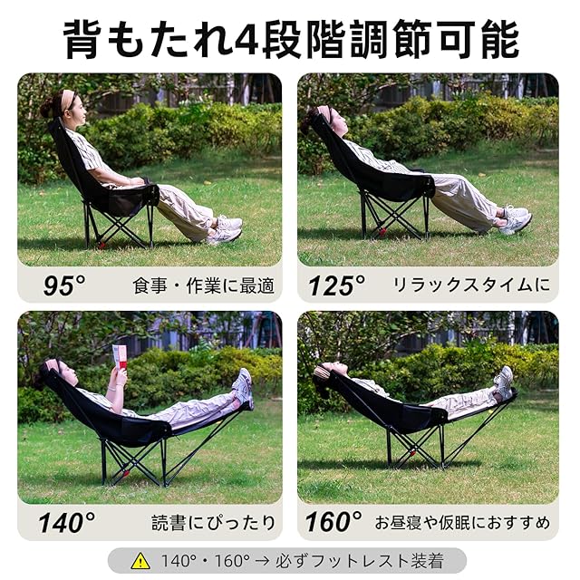 【4段階調節リクライニングチェア&キャンプ椅子】このキャンプ椅子の背もたれは、通常の折りたたみ椅子のように座るだけでなく、ベッドのように横になることで、100度から145度まで調整できます、とても快適に使用できます背もたれの角度は100°-115°-130°-145°の4段階で1秒調節でき、日差しを避けたい時、読書やビデオを見るなど場合にも適応している角度、そして完全に倒してのんびり休憩できます!キャンプ、焚き火、リビングルーム、バルコニー、オフィスなど、様々なシーンでのニーズに対応しています。;屋内でもアウトドアでも昼休みの使用されて、平らにまたはあなたの側に横たわることができます。