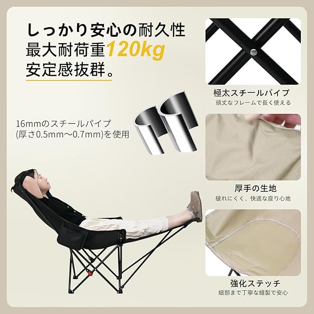 【工事現場レベル!炭素鋼フレーム&600Dオックスフォード】骨格には高剛性・高耐久の炭素鋼パイプを採用されて、椅子のシートには耐摩耗性に優れた600Dオックスフォード生地を使用されています。耐荷重120kgを誇り、様々な体格の方に安心してお使いいただけます。転倒防止ストッパー付きで、砂地や傾斜地でもガッチリ固定できます。繋がるところ部品の固定はしっかりして、とても安定感が実現しました。これが屋外でリラックスする理想的な選択肢となります。オフィスおよび他のどの野外活動でも使用することができます。