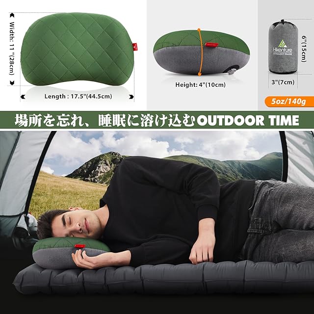 Hikenture キャンプ 枕 コンパクト【超軽量140g·コンパクト】綿カバー 洗濯可 防滑処理 エアーピロー キャンプ まくら アウトドア 枕 キャンプ用枕 エアピロー 空気枕 エアー枕 携帯枕 コットン 収納袋付き 車中泊 ツーリング グリーン 緑