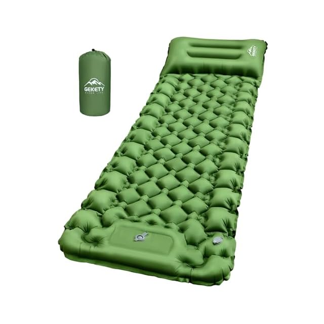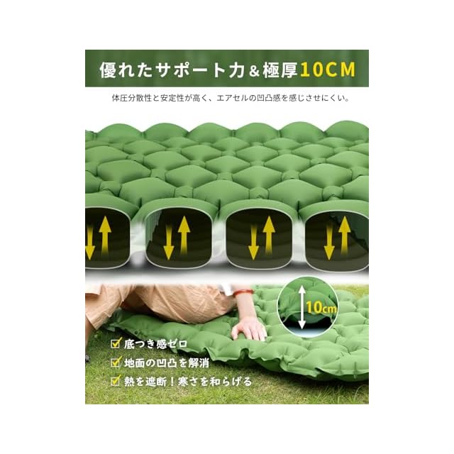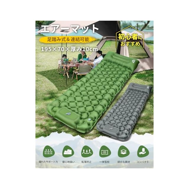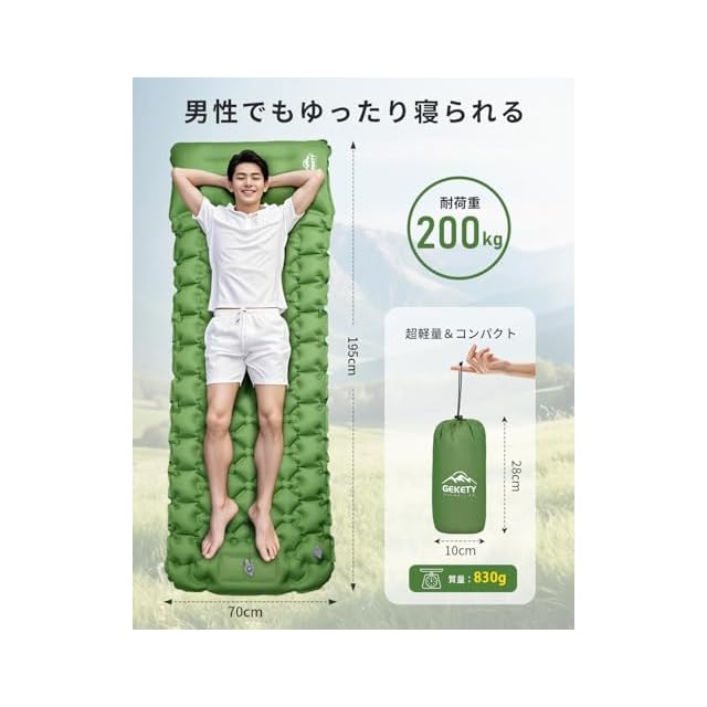 【準備・片付けが楽々!】 GEKETY エアーマット キャンプ マット 足踏み式 70×195 厚さ10cm 枕付き 無限連結可能 エアマット 車中泊 防災 来客用に コンパクトに収納 軽量800g 収納袋/補修テープ付 (グリーン)