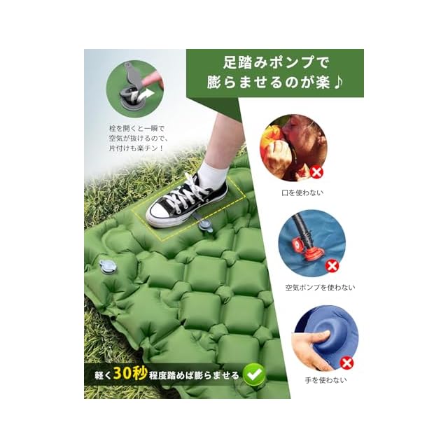 ✅【足踏み式ポンプで準備も片付けも楽々】GEKETYマットには足踏み式ポンプが内蔵されており、約1~2分の足踏みで膨らませることができます。空気入れや電動ポンプを別途用意する必要がなく、手軽に使えます。女性やお子様、高齢の方でも簡単にセットアップ可能なので、キャンプ初心者にもおすすめです。撤収時も短時間で空気を抜くことができ、時間と手間を大幅に省けます。気軽に使えるので、週末のお出かけや急な宿泊にも対応できます。