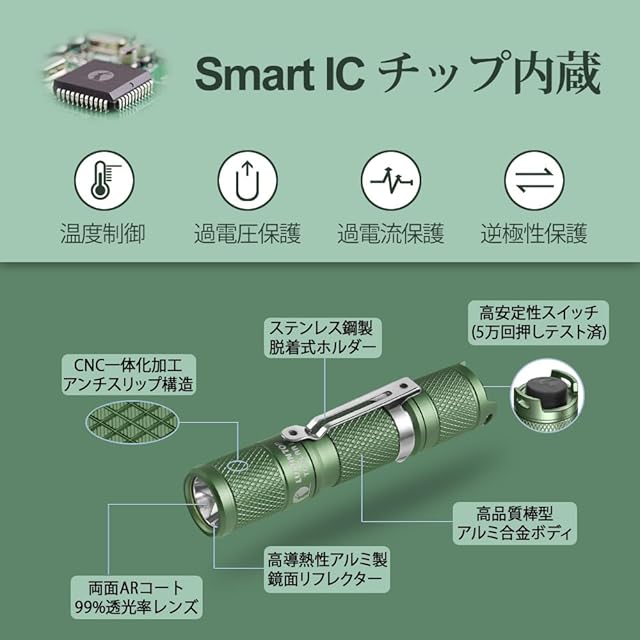 【超小型超軽量・五段階調光】航空機用アルミニウム合金を用いられた本体は、手のひらに収まれる8.9cm*1.85cmというコンパクトサイズになります。僅か23グラムの重量(電池含まず)では、500円玉3枚よりも軽く、片手で簡単に操作でき、携帯時にご負担になりません。5段階のライトモード(ターボ /高/中/ 低/ストロボ )機能を搭載しています。点灯モードはモードメモリ機能を搭載、常に使用する明るさから点灯できます。夜釣り・山登り・夜道の一人歩き・防犯・護身用・緊急災害時など様々なシーンに心強い味方です。