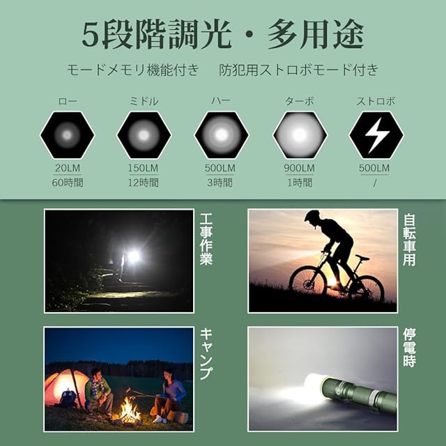 【デザイン・多場面応用】懐中電灯本体はアンチスリップデザインで滑りにくく、表面はミリタリーグレード(MIL米軍軍用規格)耐摩損処理をし、長い年月を経ても磨損や錆に負けず、きれいに長持ちさせます。テール部のフラットデザインより、付属品のディフューザーを本体に装着したら、もっと柔らかく照らせて、小型ランタンとして使えいただけます。停電時照明としては勿論、ジョギング、ルーメナー、夜釣り、ランニング、狩猟(狩り)、射撃、サイクリング、登山、洞窟探検&探索、夜間や暗いところの建築現場や工事現場、自動車整備の作業灯としてもご安心してお使いいただけます。