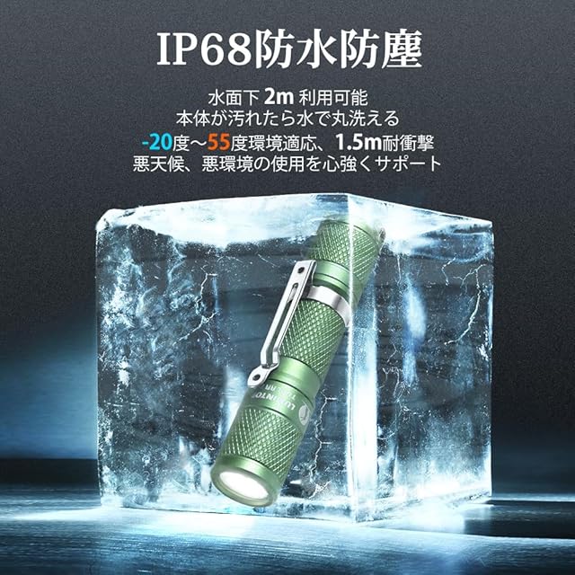 【IP68完全防水・優れた耐久性】Tool AAミニライトはJIS(日本工業規格)の最高レベル「IP68」を取得済み、「粉塵の侵入を完全に防ぎ、かつ水流や長時間の水没にも耐える」という耐塵防浸型です。水深約2メートルの環境でも、心配しなくて正常的に点灯できます。ライトが汚れたら水で丸洗いてもOK!ライト内部は衝撃吸収材を用いられて、ダメージレス構造より、1.5メートルの落下耐久を持ちます。悪天候、悪条件下のご使用を力強くサポートします。
