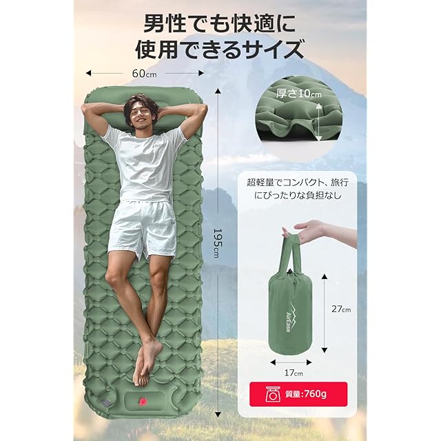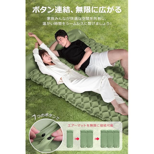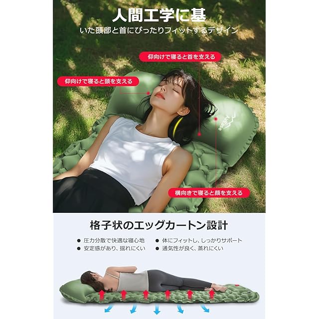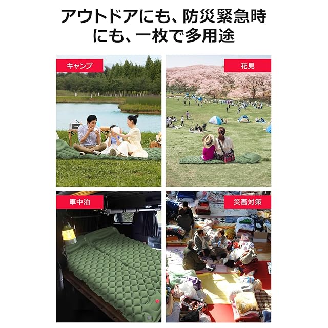 【高級ベッド級の寝心地!10cm厚のエアーマットで極上の快適さ】キャンプや車中泊で「寝心地が悪くて熟睡できない…」そんな悩みを一気に解決!このエアーマットはたっぷり10cmの厚みがあり、地面の凹凸や硬さを感じさせません。さらに、独自の凹凸クッション構造が体圧を分散し、長時間寝ても腰や背中が痛くなりにくい設計。枕一体型デザインだから、追加の枕を用意する手間も不要で、どんな寝姿勢でも快適に過ごせます。まるで自宅のベッドで寝ているような極上の寝心地を実現し、アウトドアでも翌朝スッキリ快適に目覚められます!