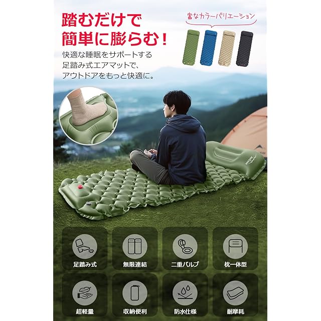 エアーマット キャンプ【2025NEWモデル・.25秒膨らむ・10CM厚さ】 足踏み式 R値4.0 厚手 枕付き 車中泊 防災 超軽量 コンパクト 防水 寝袋 持ち運び便利 簡単収納 災害マット 登山 キャンプ用品 テント 収納袋付き