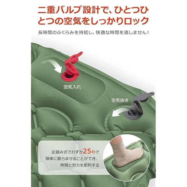 【25秒で膨らむ!足踏み式ポンプで超ラクラク】エアーマットの準備に手間をかけたくない方に朗報!足踏み式ポンプを内蔵しているので、たった25秒でフル膨張。口で膨らませる必要がなく、手を使わずに足で軽く踏むだけでOK!これなら女性やお子様でも簡単にセットアップできます。さらに、ダブルバルブ設計により空気漏れを防ぎ、一晩中しっかり膨らんだまま。寝ている途中でへたる心配がなく、朝まで快適に過ごせます。収納時も、バルブを開くだけで一瞬で空気が抜けるので、片付けもストレスフリー!アウトドアの準備をもっと簡単に、もっと楽しく。