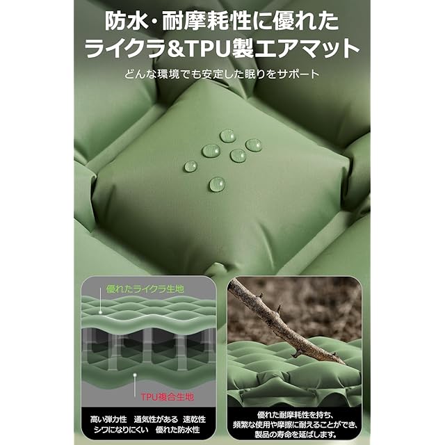 【耐久性&防水性◎ どんな環境でも快適に使える】キャンプや車中泊だけでなく、災害時の備えにもぴったり! エアーマットの表面は、耐久性に優れたライカ生地を採用。通常のナイロンよりも柔らかく肌触りが良いだけでなく、引き裂きや摩耗に強く、長期間の使用でもへたりにくい設計です。さらに、TPU防水コーティングを施し、突然の雨や湿気からしっかりガード。濡れた地面の上でも快適に使えます。汚れがついてもサッと拭くだけでOKだから、お手入れもラクラク!どんな環境でも快適な睡眠をサポートします。