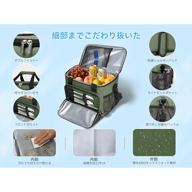 【5層断熱構造で保冷・保温力抜群】600Dオックスフォード防水生地を使用し、内部にはPEVA、不織布、5mm発泡ウレタン、撥水オックスフォード生地を採用。外気の熱を遮断し、4-6時間の保温、6-8時間の保冷が可能です。保冷剤を使えば、さらに長時間の低温維持が実現します