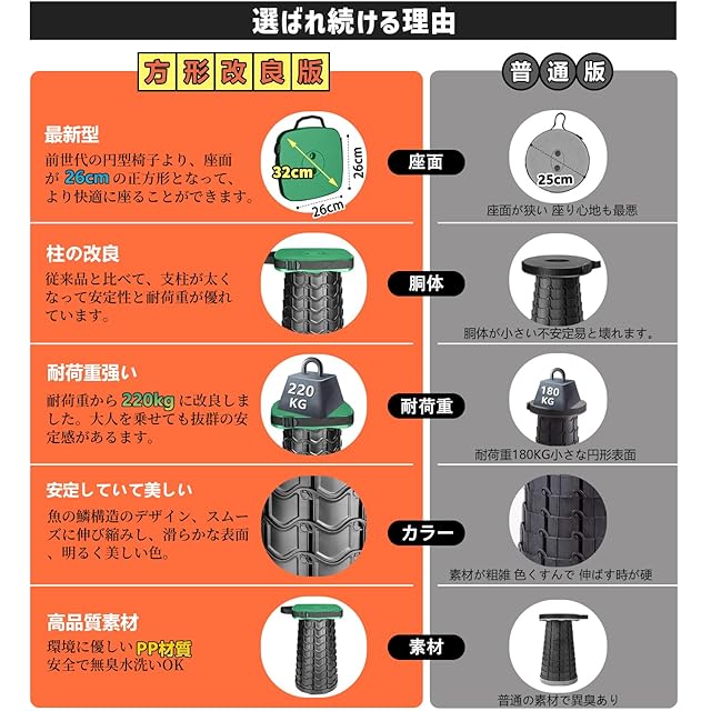 2024最新型:2024年最新型折り畳み椅子です。従来品と比べて、支柱が太くなって安定性と耐荷重が優れています。座面が26 cmの正方形となって、より快適に座ることができます
