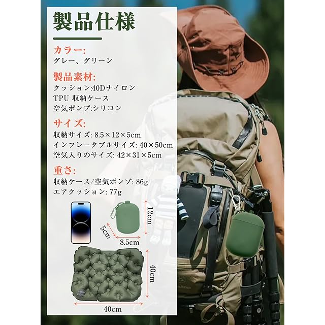 【携帯に便利&あらゆる場所に最適】エアー座布団の展開後サイズ:横42×縦31×厚さ5cm、折り畳み後のサイズは8.5*12*5cmとコンパクト。バックパックにすっきり収まり、持ち運びも楽々です。カラビナフック付き収納ケース、鞄や 自転車にぶら下げることができる、キャンプやツーリング、アウトドアだけでなくスポーツ観戦や釣りなど、長く座るような用途におすすめします。キャンプや山登りなど最適花火大会や野外イベントなどアウトドアの様々な場面できっとお役に立てる。