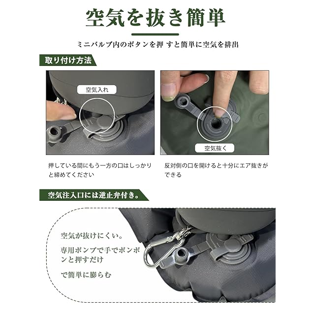 【1つで2役&エアーバルフ徹底改良】従来のエアークッションとは異なります。Funttoのエアマットシリコン収納ボックスは、エアクッションを収納できるだけでなく、シリコンボックス自体がエアポンプになります、余計な空気入れ道具が不要、。エアポンプを手で約30回押すだけで、素早く空気が充満する。エアクッションは2つのエアバルブにアップグレード。左侧から空気を入れ、右侧は排気孔で、空気を入れる時は、右の排気孔を閉じて、ポンプで空気を入れます。旧モデルとの比較、バルブ中央の赤いボタンを押す必要がなく、右側の排気バルブを開ければ簡単に空気を抜くことができる。