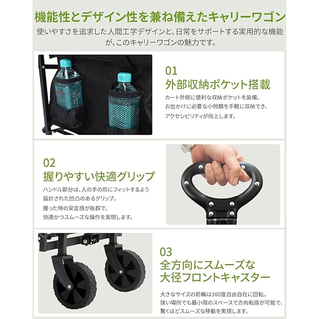 軽快な操作 & 快適な使い心地: 滑り止め加工の伸縮ハンドル(65-90cm調節可能)と、砂利道や草地もスムーズに走行する360°全方向回転ノーパンクタイヤを搭載。あらゆる地形で軽快な移動を実現。便利なフロントメッシュポケットも装備。