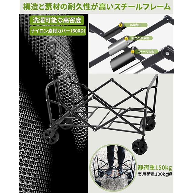 100kg耐荷重 & 頑丈な構造: 防錆処理スチールフレームと高密度600Dオックスフォード生地の強固な組み合わせで、耐荷重100kgを実現。重い荷物や過酷なアウトドア環境での使用にも安心の耐久性。防水加工で天候にも強く、長く愛用できます。
