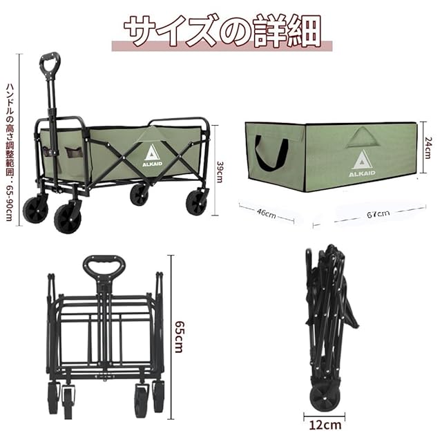 ALKAID キャリーワゴン キャリーカート アウトドアキャンプカート 折りたたみ式 ワイドタイヤ搭載 耐荷重100kg 大容量120L 自立式収納 コンパクト キャンプ BBQ 釣り 買い物 (グリーン)
