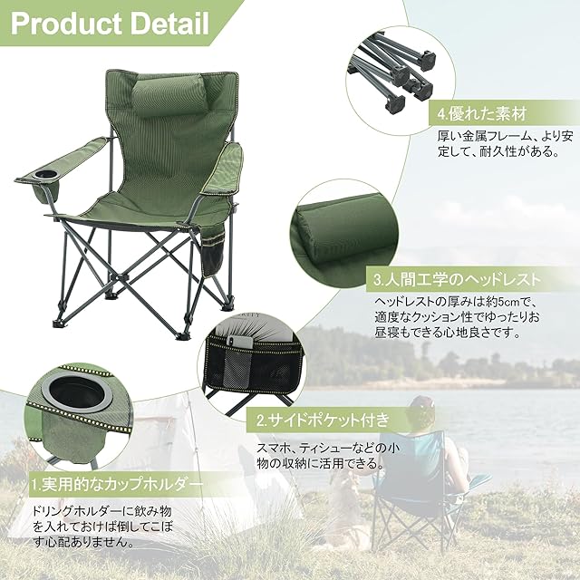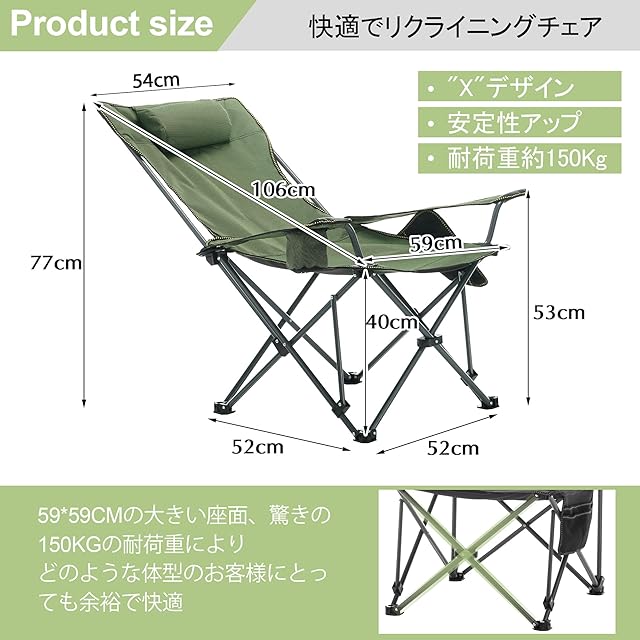 【人間工学デザイン&耐荷重】 背もたれは人間工学に基づいて、頭、臀部、背中を支えるように設計されており、横になっているときに余暇を楽しむことができます。 製品の耐荷重性能は高水準でテストされ、145kgの耐荷重確保されています。どんな状況においても、信頼性と安心感を持って使えるアウトドア椅子です。