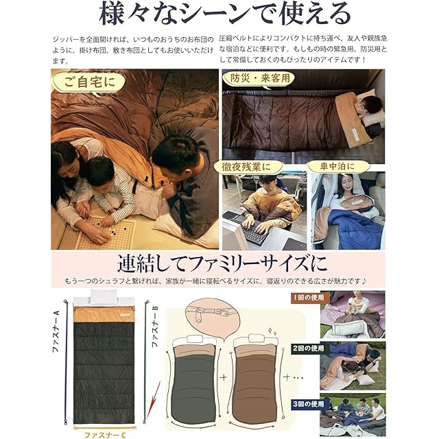 注意:本製品は2つ連絡可能な寝袋で、寝袋を複数購入する場合、連結して2人以上での宿泊が可能です。 また、寝袋のデザインも市場より広くなっており、 通常の状況下では、大人子供及び子供ふたりを同時に収容できます。二人以上の大人の場合は2個をご購入をオススメします。