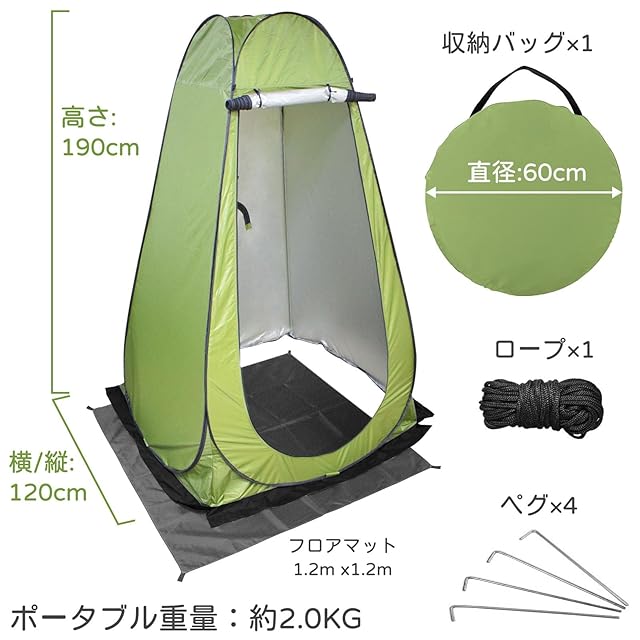 【1門3窓・展開スペース広い】テントのサイズは約120×120×190cmと、大人が手を挙げても邪魔にならない余裕のゆったりスペースなので、着替えやシャワーが楽々です。合計3つの小窓をついており、通気性が良くて、テント内は蒸し暑くならないし、周りの様子も確認できます。付属品:ペグ*4 、ロープ*1、収納バッグ*1、フロアマット*1。