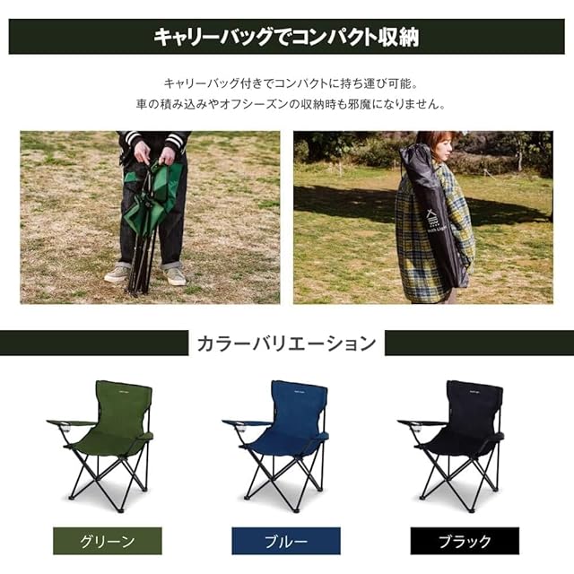 【仕様】 製品名:アウトドアチェア 材質:スチール(フレーム)、ポリエステル(座布) サイズ:組立時 約W82xD48xH78cm 収納時 約W81xD15xH15cm カラー:グリーン 重量:約1.7kg(1個あたり) 耐荷重:約100kg(1個あたり) 同梱品:本体、収納バッグ(ポリエステル製)