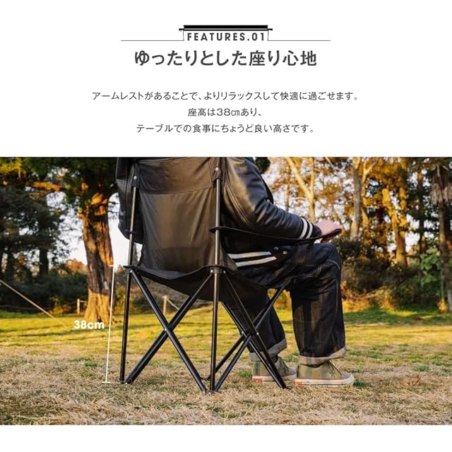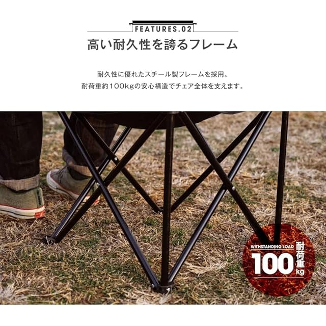 【折りたたみ式チェア/耐荷重100kg】2025キャンプやレジャーに最適な折りたたみ式チェアです。しっかりと固定されたスタンドパイプは安定感があります。ちょうどいい高さでハイテーブルでの食事にも便利です。最大耐荷重は100kgで、しっかりと体重を支えて安心です。