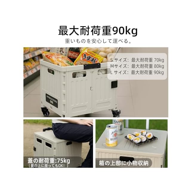 【選べる3サイズ!高耐荷重&フタ付きで座れる設計】本製品はS・M・Lの3サイズをご用意。用途や収納量に応じて最適なサイズをお選びいただけます。耐荷重:70kg。さらに、全モデルにフタ(蓋)付き。このフタは最大75kgまでの耐荷重に対応しており、大人がそのまま座ることも可能です。イベント会場やアウトドア、行列待ちのときなど、椅子代わりにも使える便利な仕様となっています。ご注意ください:Sサイズのハンドルの傾斜角度は調整できません。MサイズとLサイズは上下90°の調整が可能です。