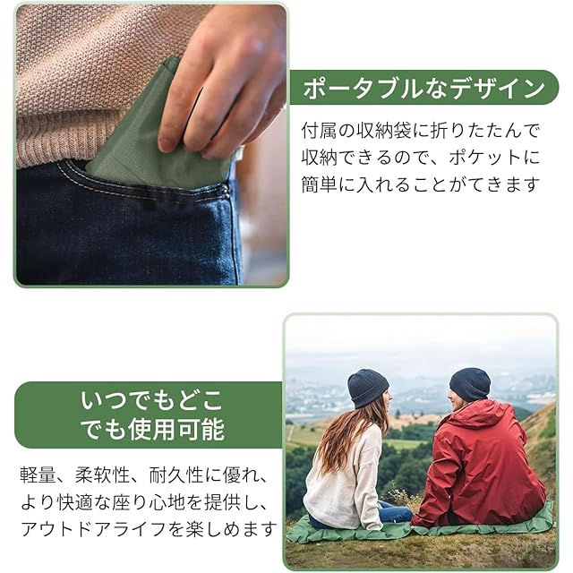 【高品質材採用、優れた耐久性】:レジャーシートの表面には丈夫な40Dナイロンと多層構造で耐久性のあるTPU素材を使用、TPUの防水防湿コーティングが施されています。これにより、耐摩耗性が高く、裂けにくくなっています。突然の雨でも安心、表面をサッと拭くだけで清潔を保てます。いつでもどこでも清潔で快適な座り。アウトドアマット、キャンプマット、テントマットなど、さまざまな用途に使用されます。キャンプ、登山、キャンプ、オフィス、宿泊に使用できます。