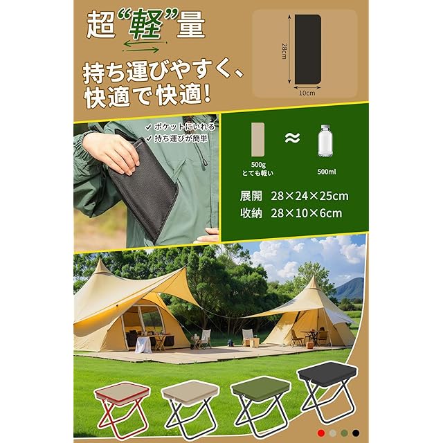 【シーンを選ばない汎用性】組立時間20秒・収納時間15秒の簡単操作で、キャンプや花見はもちろん、以下の多様な場面で活躍:1.通勤ラッシュ時の駅構内待機、2.子どものスポーツ観戦や発表会、3.災害時の避難所備品、4.釣りや農作業の休憩用、5.イベント会場の行列待ち。