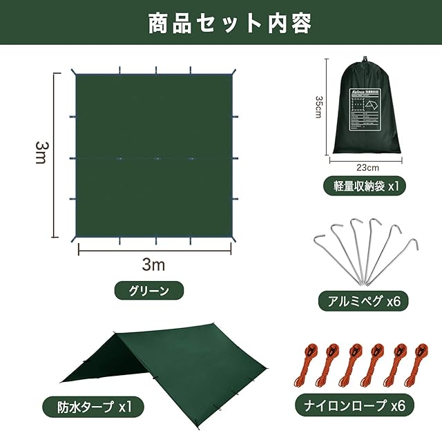 【耐久性・超軽量】この素材は軽くて柔軟性があり、強度があるので、擦り傷やパンクを防ぐことができます。 製品は、6本のペグ、6本のロープとバッグが含まれている。 ペグはアルミ製なので、とても丈夫で錆びる心配もありません。 旅行に最適なテントタープです。