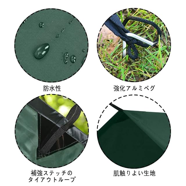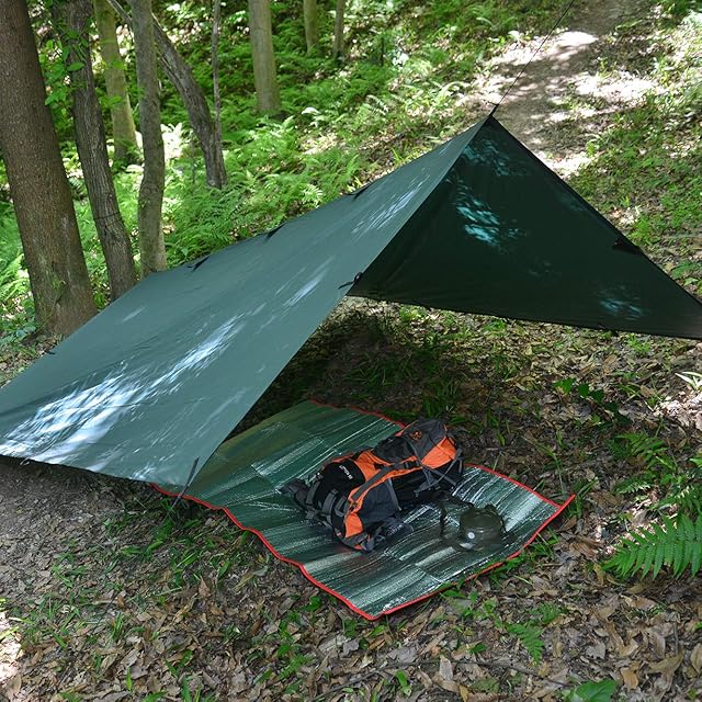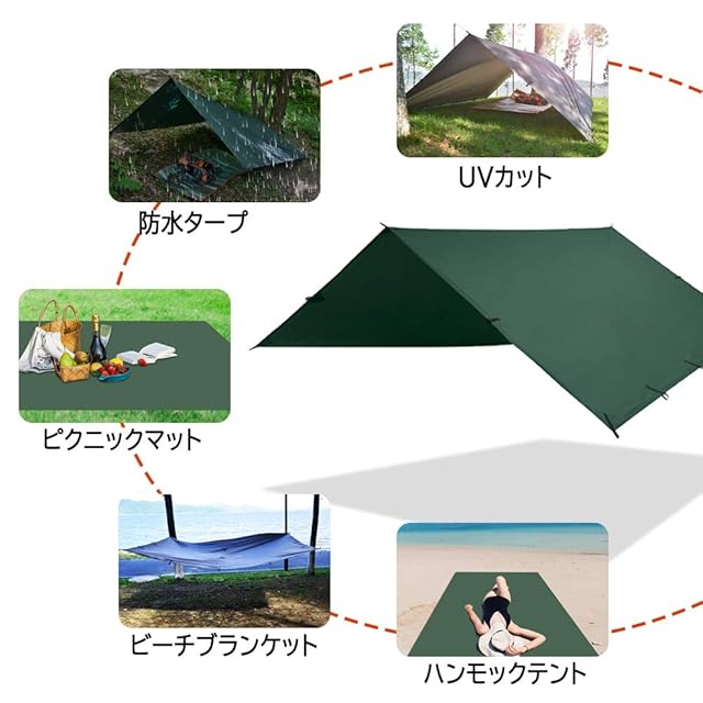 【様々なシーンで活躍】:登山、キャンプ、釣り、旅行、パーティーなどに最適です。タープを広げ、床に敷いてピクニックマットとしても使えます。釘やロープを使って日よけや雨よけにすることもできる。