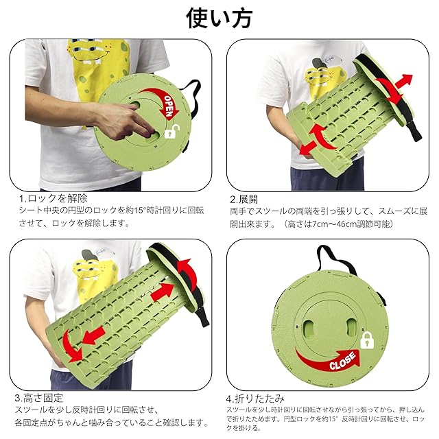 【楽々収納&簡単に折りたためる】 重さは1Kgぐらい、収納サイズは7cm*26cm,取っ手、ストラップ付き、楽に持ち運びできます。もちろん、リュックに入れても平気に持ち運びできます。 指をスツール両辺の小孔に挿して、ひねりながら伸ばして、好きな高度に引いて回転して固定します。逆方法に少しひねりを入れながらスツールの両端を押すだけで一瞬で収納可能です。