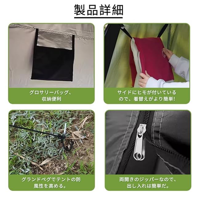 「雨&日焼け対応」テントは高品質な190Tポリエステル素材が採用し、内側に目隠しの銀コーティングされ遮断力が抜群で、プライバシーが確保できます。UPF 50+生地は紫外線をカットでき、肌の日焼けを防げます。防水撥水性を備えて、水に濡れても染み込みにくく、突然の雨にも対応可能です。