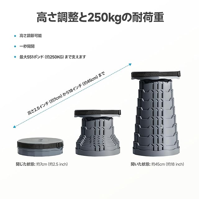 【折りたたみ可能・高さ調整自在】:この折りたたみ式キャンプベンチは、わずか数秒でスムーズに開閉が可能。軽くひねるだけで確実にロックでき、設置も簡単かつスピーディー。高さは約7CMから45CMまで自在に調整でき、あらゆる体型の大人に対応します。このスツールは、卓越した耐久性と心地よい携帯性を兼ね備えた逸品であり、家族や友人と共に過ごすアウトドアのひとときをより快適に彩る存在です。自然の中でくつろぐにも、旅先でのひと休みにも最適なこの一品は、あなたのライフスタイルに寄り添う信頼のパートナーとなるでしょう。