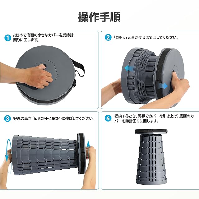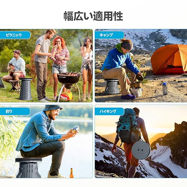 【使いやすさと広い用途】とても簡単に使えます。折り畳みスツールの両端を持ち、軽く回すだけで広がります。室内・室外を問わず、あらゆるシーンで活躍します。室内では: リビング、寝室、浴室、キッチン、オフィスなどで。アウトドアでは: ガーデニング、ハイキング、バーベキュー、キャンプ、イベントでの待機、釣りなどに。様々な場面で、快適なひとときをお約束します。