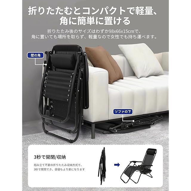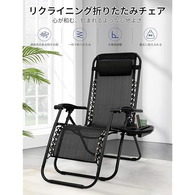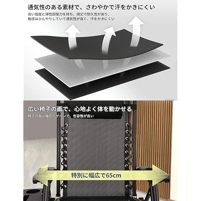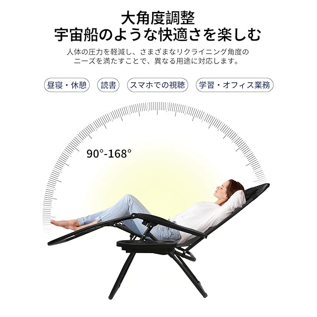 超耐荷材質:高品質の炭素鋼材質、強度が十分です。耐荷重(静止荷重)は余裕の約120kgです。ゼログラビティーアウトドアチェアはストレスフリーの無重量感覚で最大限のリラクゼーションを実現します。