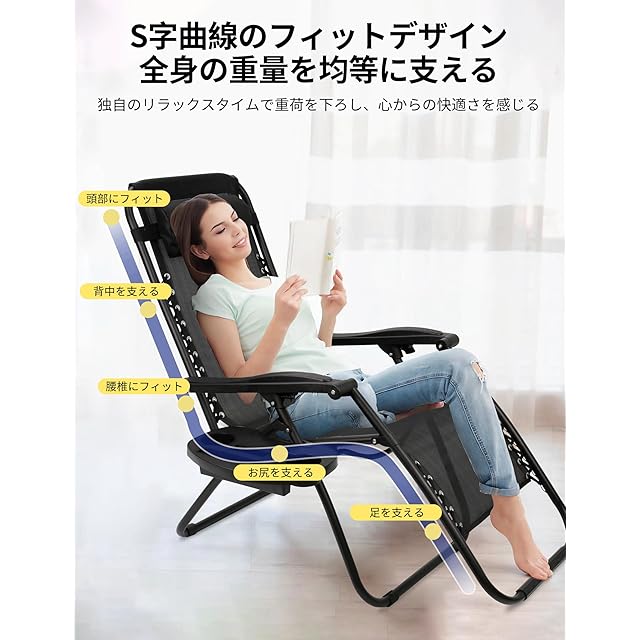 超耐荷材質:高品質の炭素鋼材質、強度が十分です。耐荷重(静止荷重)は余裕の約122kgです。ゼログラビティーアウトドアチェアはストレスフリーの無重量感覚で最大限のリラクゼーションを実現します。