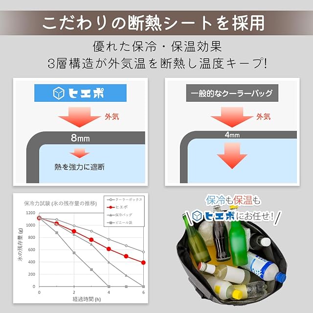【こだわりの優れた保冷力】ヒエポは厚みのある断熱生地を使用しており、一般的なソフトクーラーバッグよりも高い保冷力があります。またバッグ自体が自立するほど生地が厚くしっかりしています。上部の高品質ファスナーで密閉することで、こだわりの保冷力を実現。長時間内部の温度を保ち、保冷力は最強です。また、冬に温かいものを持ち運ぶ時にも便利です