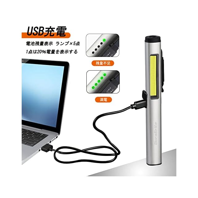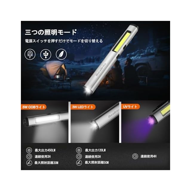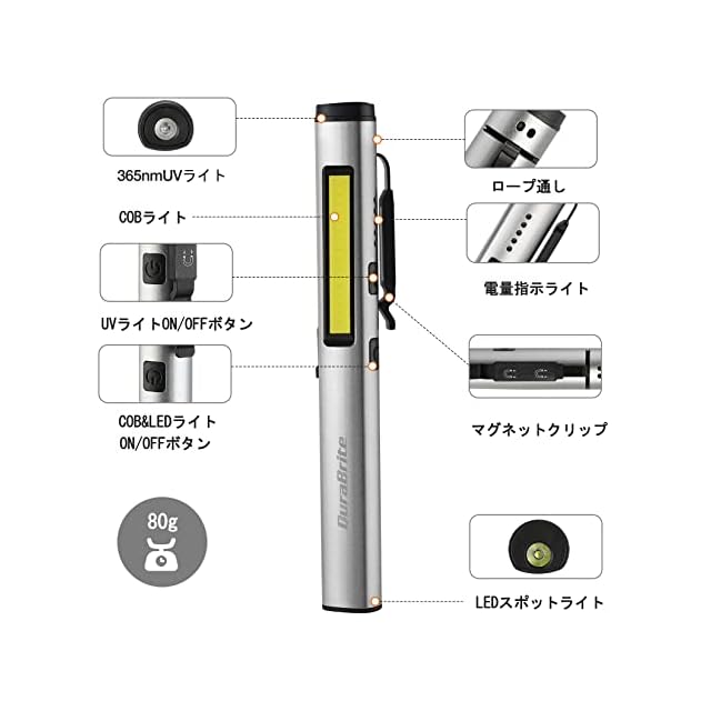 DuraBrite 懐中電灯 ハンディライト LEDライト ペンライト COBフラッドライト 365nm UVライト 紫外線ライト 多機能 USB充電式 小型 軽量 点検 偽札防止 鉱物鑑定 蛍光増白剤確認 グレー