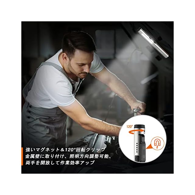 【一台三役】LEDライト・COBライト・UVライト3つの照明モードがあります。①正面は最大出力450ルーメンのCOBライトを搭載し、均一な面で発光するため、光りのバラつきを抑え、ムラのない白色光を提供して、より広い領域が照らされます。②先端のLEDライトは強力なスポットライトを提供して、より長い距離を照射ことができ、懐中電灯としてご利用できます。③尾端はUVライトを搭載、波長365nmの紫外線で蛍光効果がありです。紙幣、偽造品の識別・蛍光剤や増白剤等の残留確認・ペットの真菌などを検出ことができます。